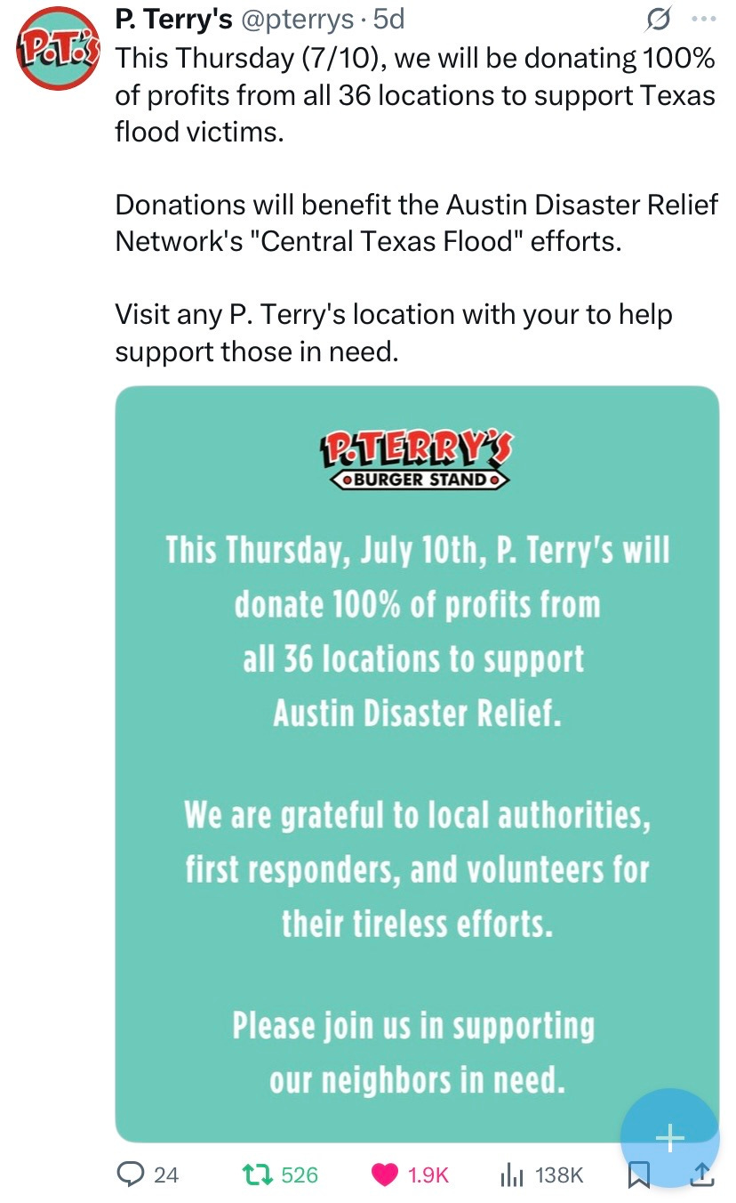 And every occasion they can give back, they do. While Kerrville and Kerr County were the most impacted by the recent flood in Central Texas, so was Travis County (where Austin is) as well. The majority of the flooding happened on July 4, on the eve of P. Terry’s 20th anniversary. Two days after their anniversary, P. Terry’s announced that, on July 10, the company would donate all profits from that day from all of its locations to Austin Disaster Relief.